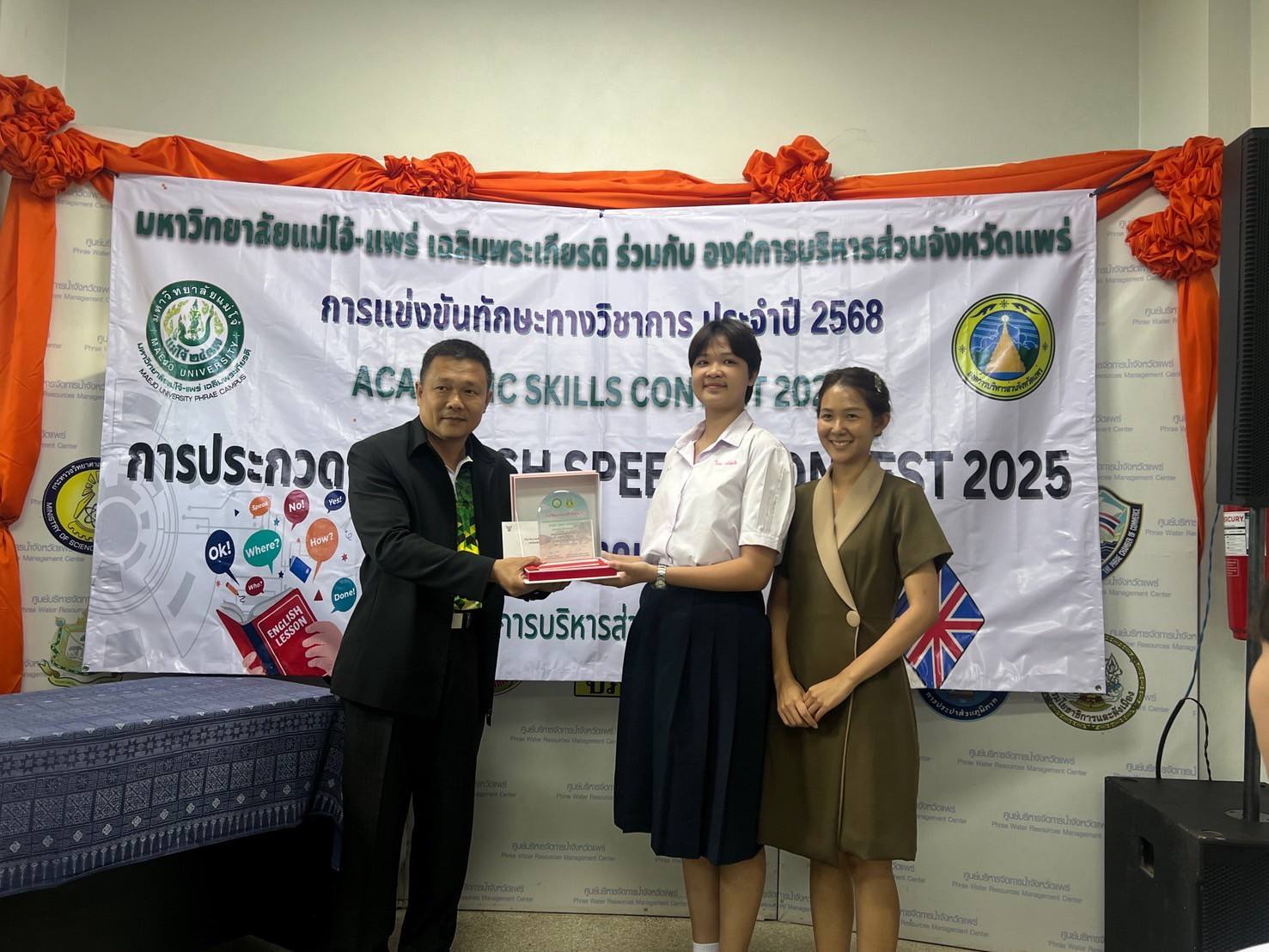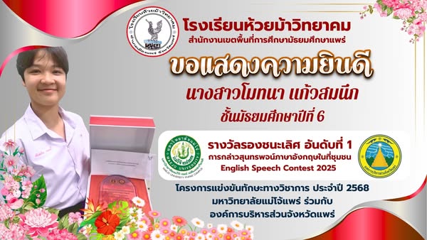 นางสาวโมทนา แก้วสมนึก นักเรียนระดับชั้น ม.6 โรงเรียนห้วยม้าวิทยาคม ที่ได้รับรางวัลรองชนะเลิศ อันดับที่ 1 การแข่งขันกล่าวสุนทรพจน์ภาษาอังกฤษในชุมชน ในโครงการแข่งขันทักษะวิชาการ ประจำปี 2568 มหาวิทยาลัยแม่โจ้แพร่ ร่วมกับองค์การบริหารส่วนจังหวัดแพร่ เมื่อวันที่ 3 กรกฎาคม พ.ศ.2568 |