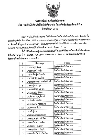 ประกาศรายชื่อนักเรียนผู้มีสิทธิ์เข้าศึกษาต่อ ในระดับชั้นมัธยมศึกษาปีที่ 4