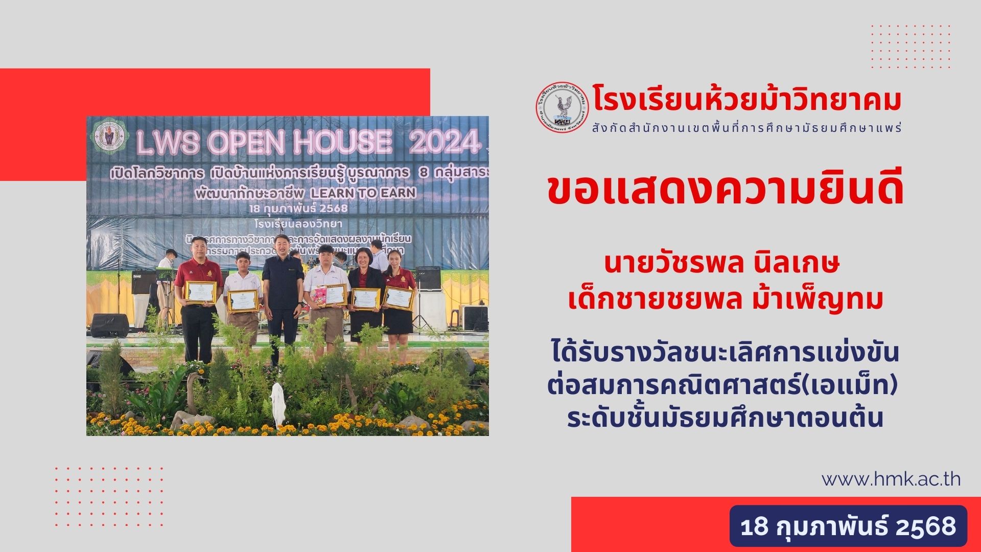 โรงเรียนห้วยม้าวิทยาคม ขอแสดงความยินดีกับ นายวัชรพล นิลเกษ นักเรียนระดับชั้น ม.3 และ เด็กชายชยพล ม้าเพ็ญทม นักเรียนระดับชั้น ม.1 ที่ได้รับรางวัลชนะเลิศการแข่งขันต่อสมการคณิตศาสตร์(เอแม็ท) ระดับชั้นมัธยมศึกษาตอนต้น งานเปิดบ้านวิชาการ "LWS OPEN HOUSE 2024" โรงเรียนลองวิทยา เมื่อวันที่ 18 กุมภาพันธ์ 2568 |
