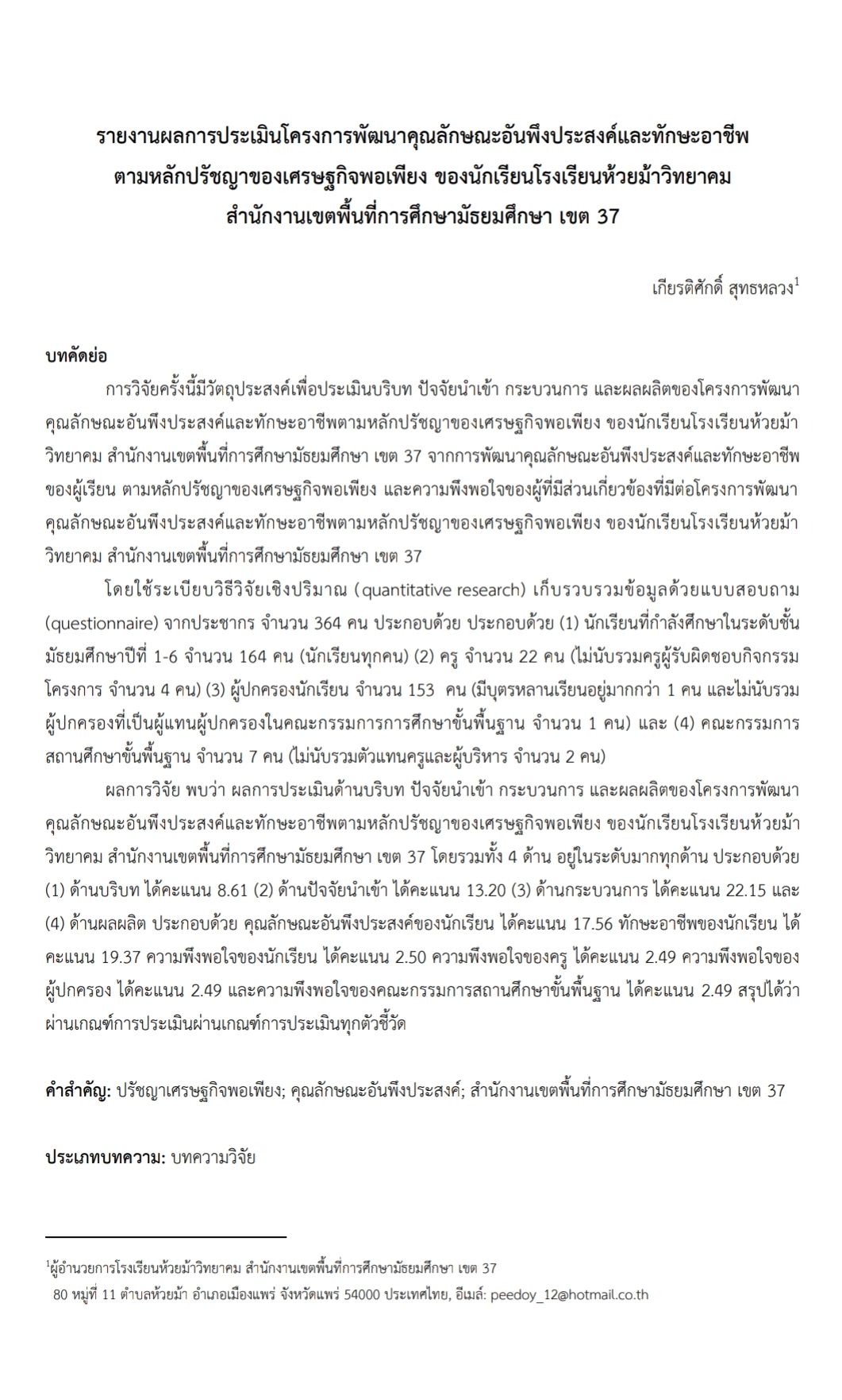 รายงานผลการประเมินโครงการพัฒนาคุณลักษณะอันพึงประสงค์และทักษะอาชีพตามหลักปรัชญาของเศรษฐกิจพอเพียง ของนักเรียนโรงเรียนห้วยม้าวิทยาคม